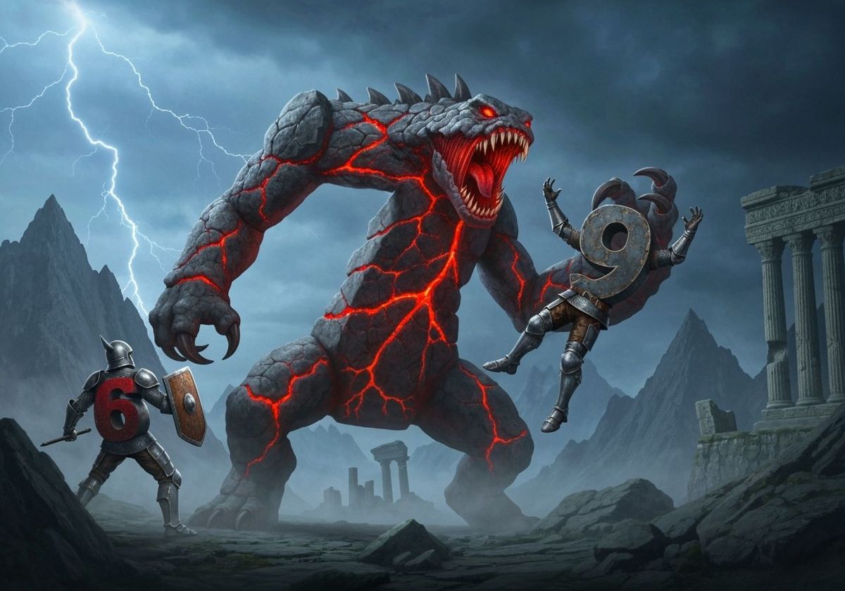 This image shows a colossal volcanic monster, number 7, seizing an armored warrior, number 9, with a distressed number 6 nearby. Set against a stormy, mountainous backdrop with a ruined temple, rendered in a dramatic digital matte painting style.