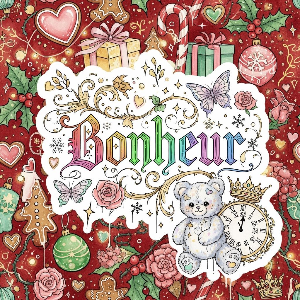 A hand-painted, sticker-style Christmas background featuring festive elements like candy canes and ornaments. The word "Bonheur" is written in elegant gothic calligraphy, surrounded by roses, butterflies, and crowns.