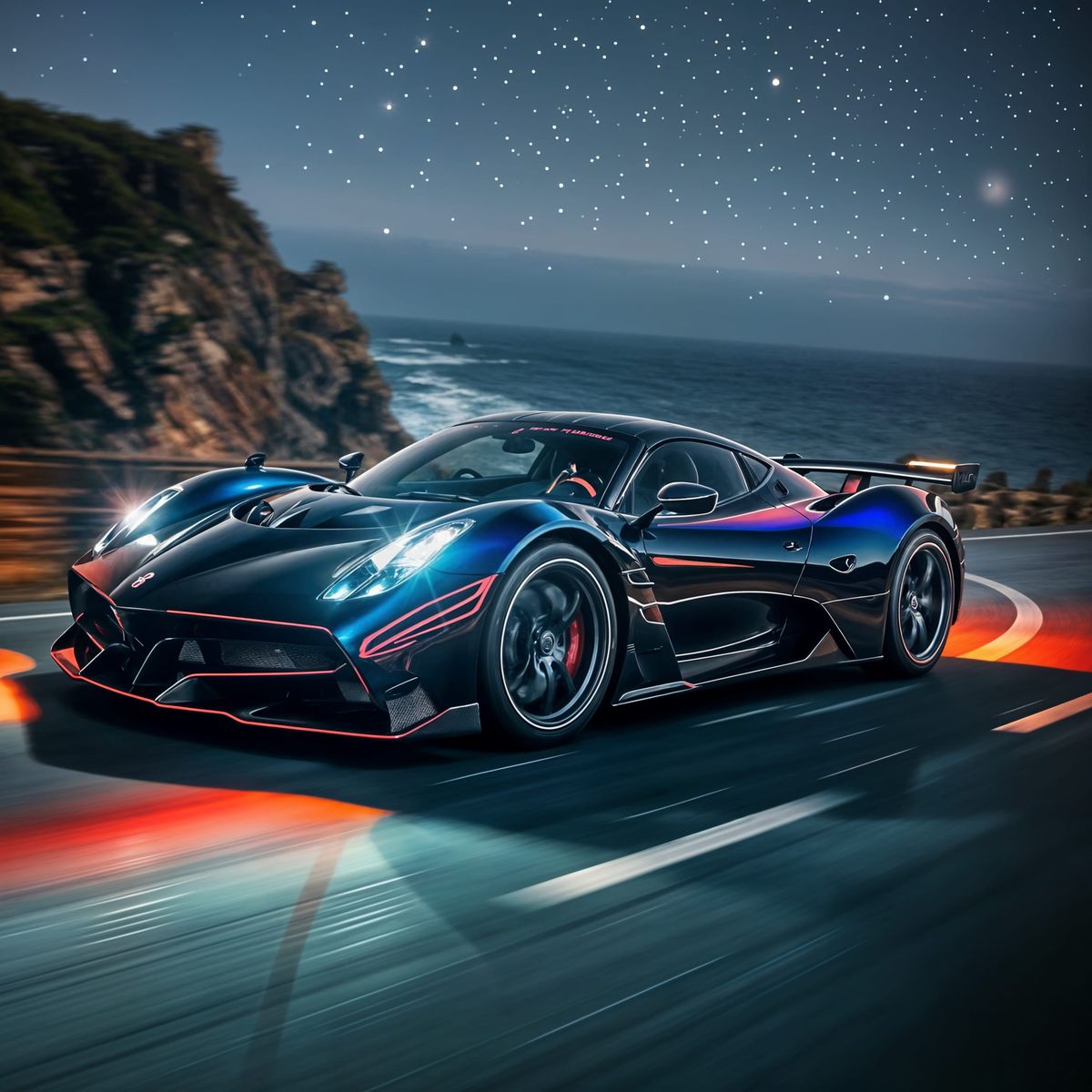 This image shows a luxury car speeding on a coastal road at night. The hyperrealistic photograph captures the car's sleek design and vibrant colors, with its headlights illuminating the road.