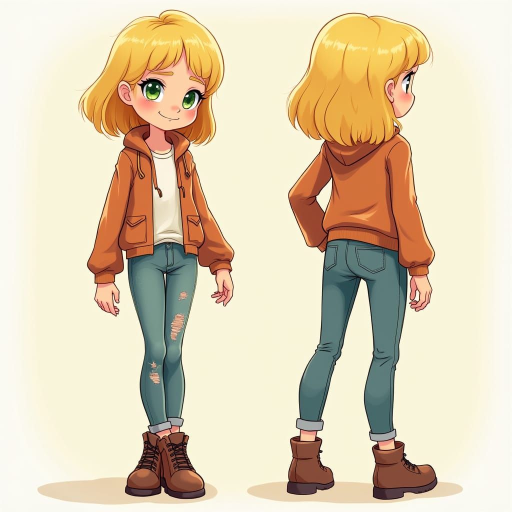 This image shows a full-body character sheet of a young woman in a cartoon style. She has blonde hair, green eyes, and is wearing modern Seattle-inspired clothing in warm, vibrant colors.