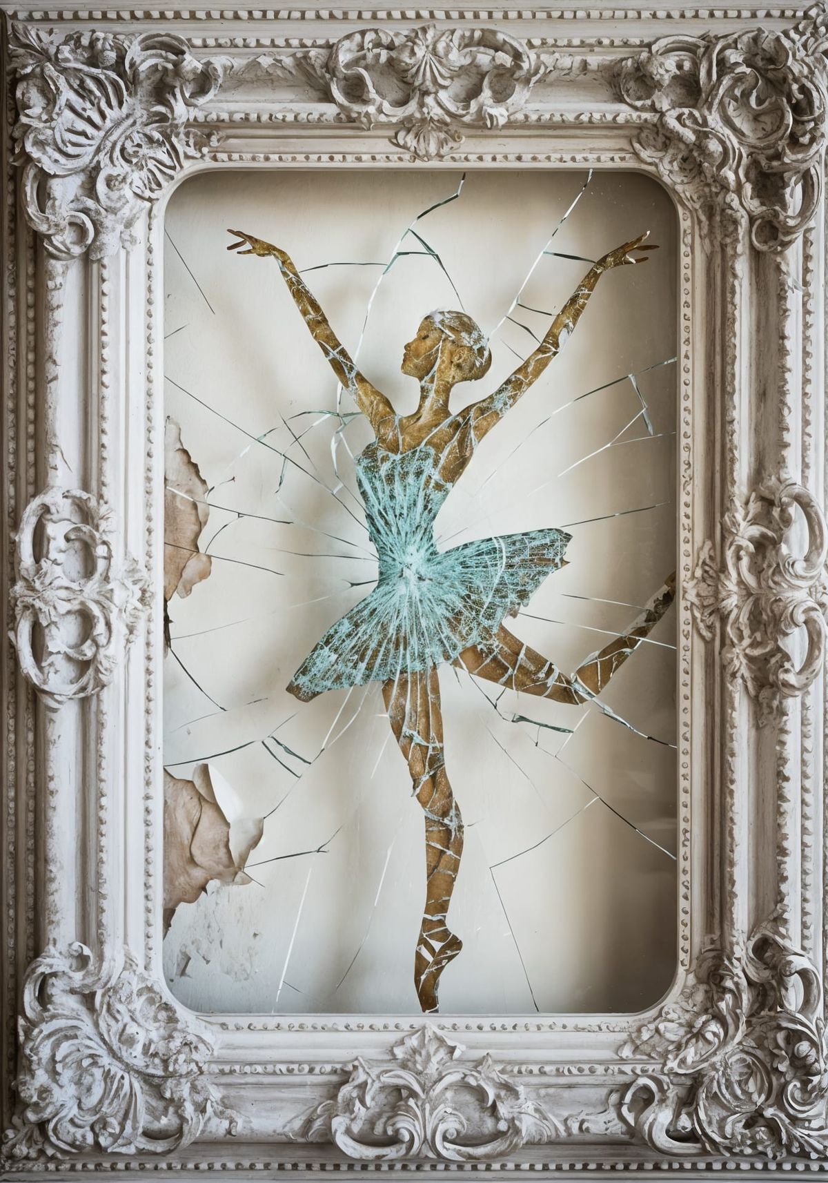 A striking picture of a ballerina composed of fine white cracks and jagged shards, posed as if dancing. The artwork is set against a black glass surface with a white frame, reminiscent of Rococo art.