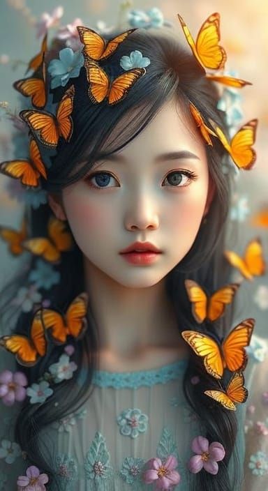This image shows a serene Asian girl in a delicate dress, surrounded by butterflies and flowers. The vibrant oil painting style, soft focus, and warm lighting create a dreamlike, ethereal atmosphere.