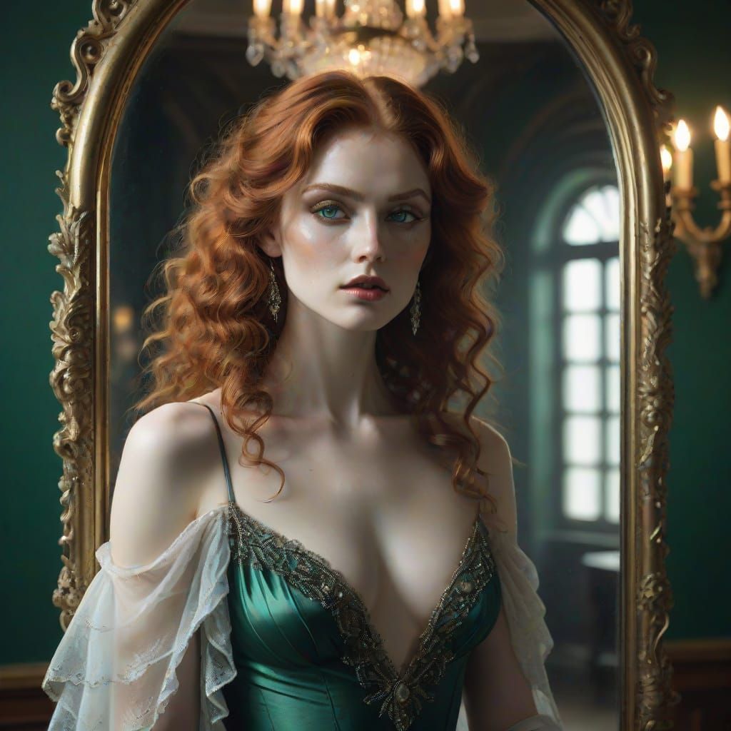 This image shows a vulnerable woman with emerald eyes and auburn hair standing in a Victorian ballroom. The chiaroscuro effect creates a ghostly silhouette in the mirrored room.