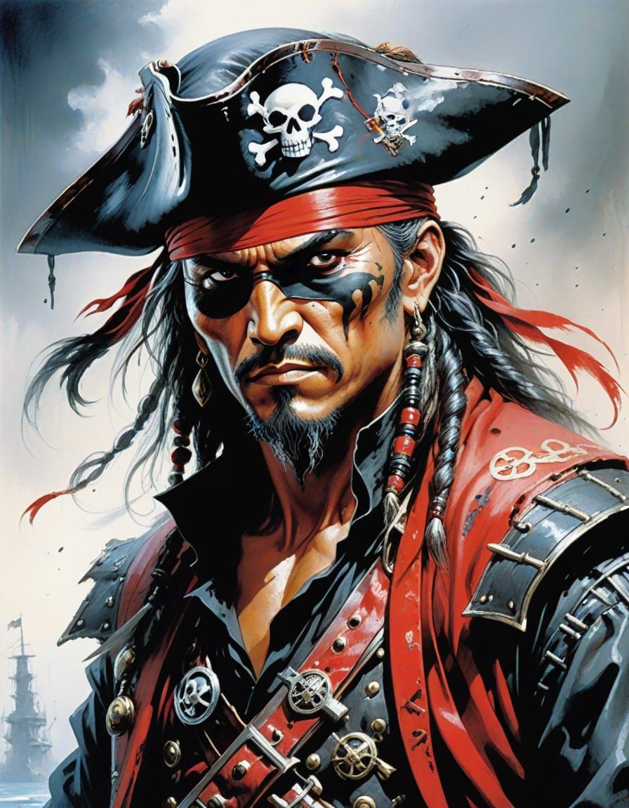 This image showcases a bold and dramatic pirate portrait, blending dark and rich colors with a sense of swashbuckling adventure. Inspired by the works of masters in the fantasy art genre.