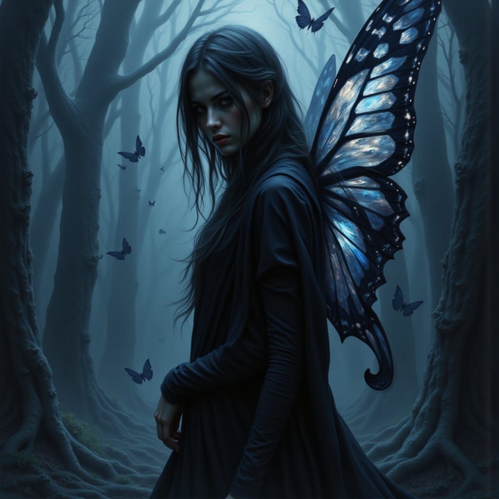 This image shows a woman formed from abstract shapes and translucent colors, with a sad, lonely expression. The artwork features geometric butterfly wings and a palette of greys, blacks, and deep blues, conveying a sense of depression.