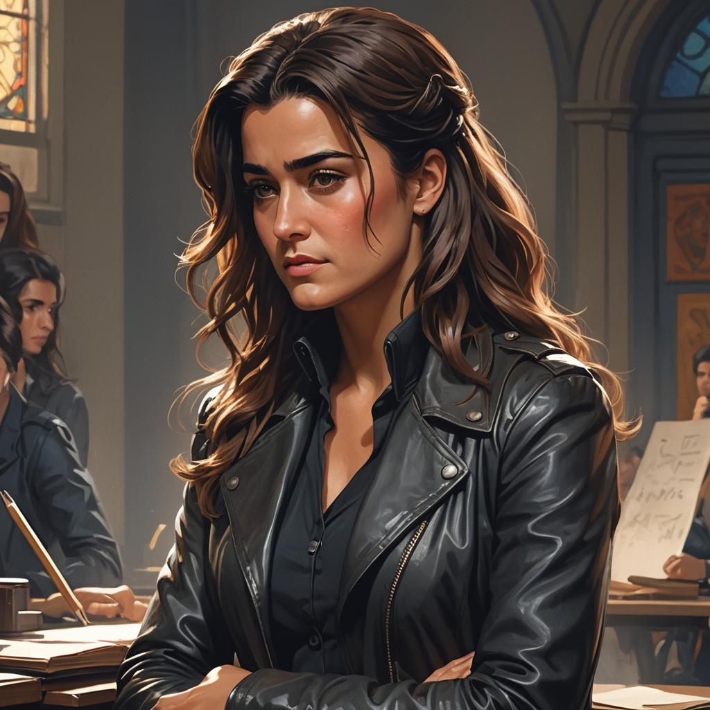 A detailed portrait of a stern teacher in a classroom. The image features dynamic lighting, intricate details, and triadic colors, rendered with volumetric lighting in Unreal Engine 5.