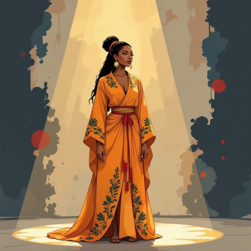 A striking picture of a Black artist on stage in a flowing robe. The scene is illuminated by soft golden light, showcasing a watercolor and ink illustration with textured abstract patterns.
