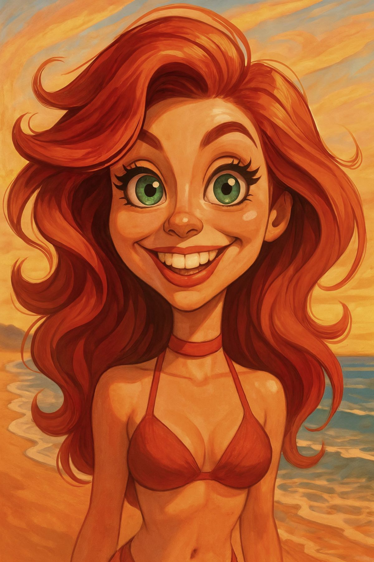 A striking close-up caricature of a young woman with vibrant red hair and emerald eyes on a golden beach. The image captures the scene's energy with simplified, expressive lines and warm tones.
