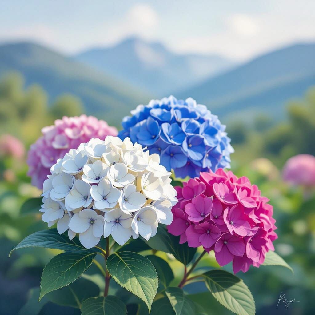 This image showcases white, blue, and fuchsia hydrangea flowers with a happy mood. Soft lighting and blurred mountains create depth, rendered with loose brushstrokes and bleeding colors in a dreamy style.