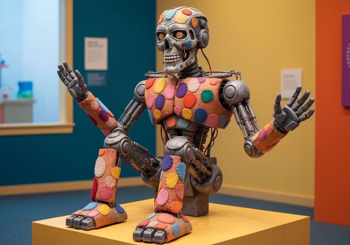 This image shows a colorful Terminator robot sculpture designed for a children's museum. The robot features a patchwork felt skin and visible wire frame in a mixed media style. Its cheerful expression welcomes young visitors.