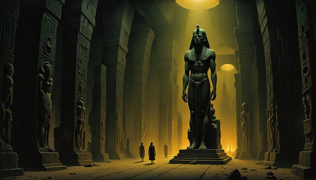 A haunting, low-lit museum scene featuring ancient Egyptian exhibits, ominous shadows, and flickering torches, evoking a sense of foreboding and mystique in a dark fantasy style.