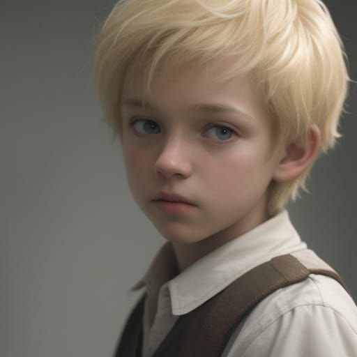 This image depicts a blond-haired boy in a cinematic style. The portrait features film grain, vignette effects, and dramatic, atmospheric lighting reminiscent of a film still.