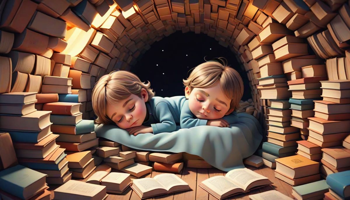 This image shows a small child asleep inside a cozy cavern constructed from books. The scene is rendered as a cute 3D toon, creating a whimsical and comforting image.
