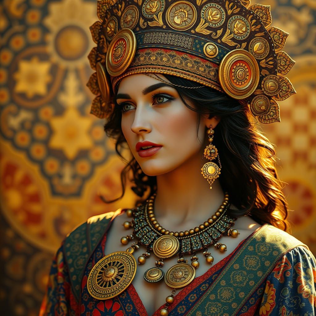 A vivid portrait of a Scythian woman in ceremonial dress. The figure is adorned with gold jewelry and the image is rendered with shimmering light in an art nouveau style.