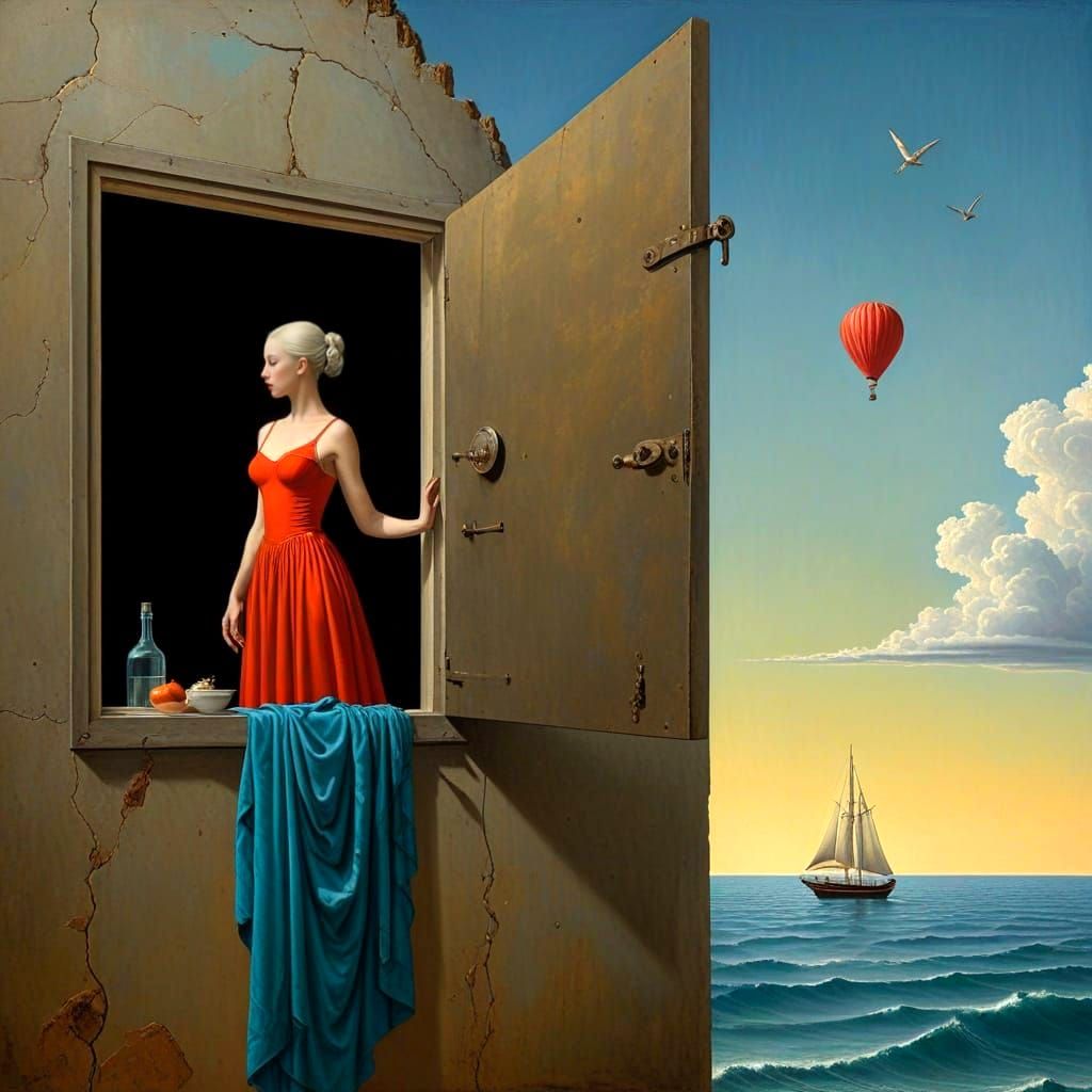 fantastic surreal image by Catrin Welz-Stein, Dorothea Tanning, Evandro Schiavone, Salvador Dali, Ithell Colquhoun, James Ensor, Johfra Bosschart, Giorgio de Chirico, Yves Tanguy, Georgia O’Keeffe, Gertrude Abercrombie, Paul Delvaux, Rene Magritte, Andy Kehoe, Catherine Hyde, Max Ernst, mysterious, enigmatic, ...
