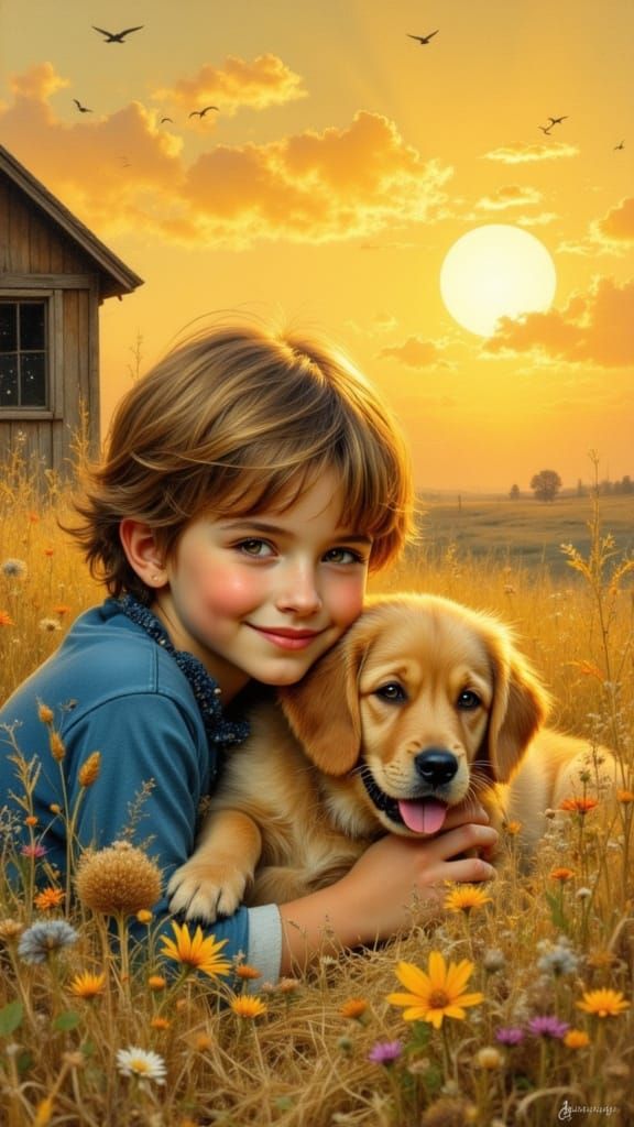 A heartwarming impressionistic oil painting capturing a boy and puppy's bond amidst hay. Features a rustic barn and vibrant sunset, evoking peaceful rural life.