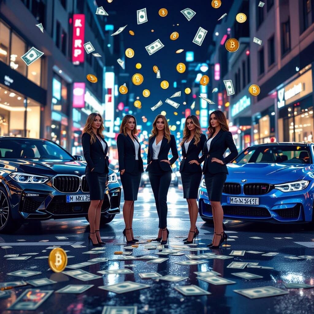 This image shows women in business attire on a modern street in Kaunas with luxury BMWs, dollar bills, and crypto symbols. Rendered in a hyperrealistic digital art style, it emphasizes wealth and ambition.