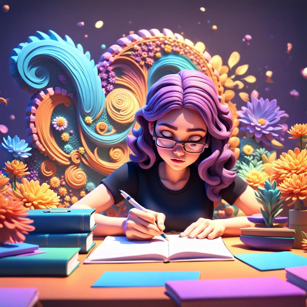 This image depicts a girl writing in a notebook at her mum's funeral. The scene is rendered as bright colored 3D digital art with cinematic lighting and a radial gradient background.