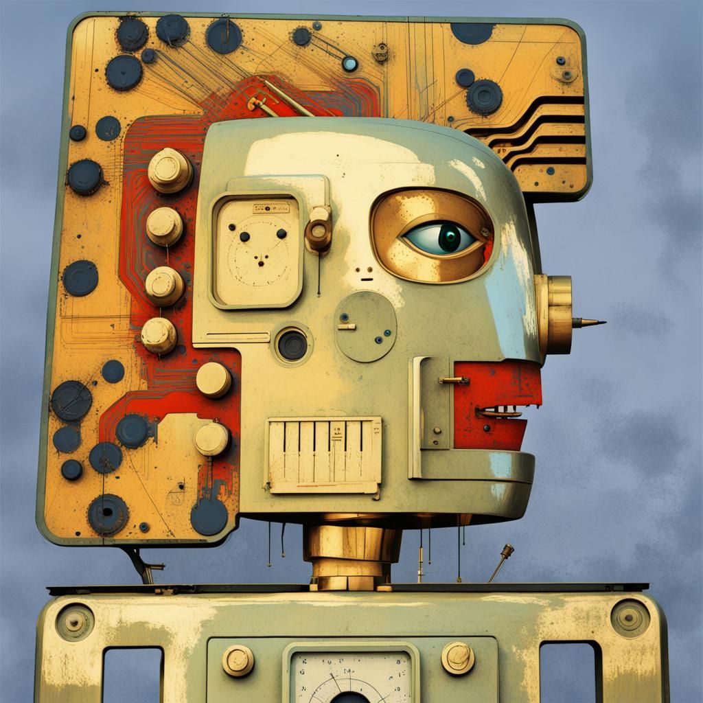 A digital rendering of a cyborg robot with brass skin against a blue sky backdrop. This vibrant pop art style image features triadic colors, geometric Bauhaus elements and symmetrical composition.