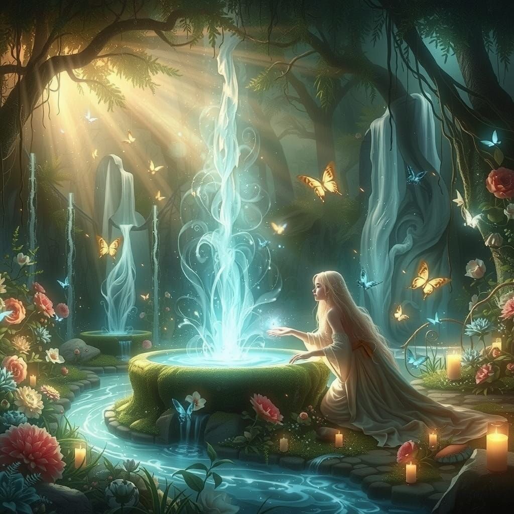 This image shows a figure in white at the mystical Fountain of Youth. The fantasy scene features glowing water, flowers, and butterflies in soft light, with an enchanting and romantic atmosphere.