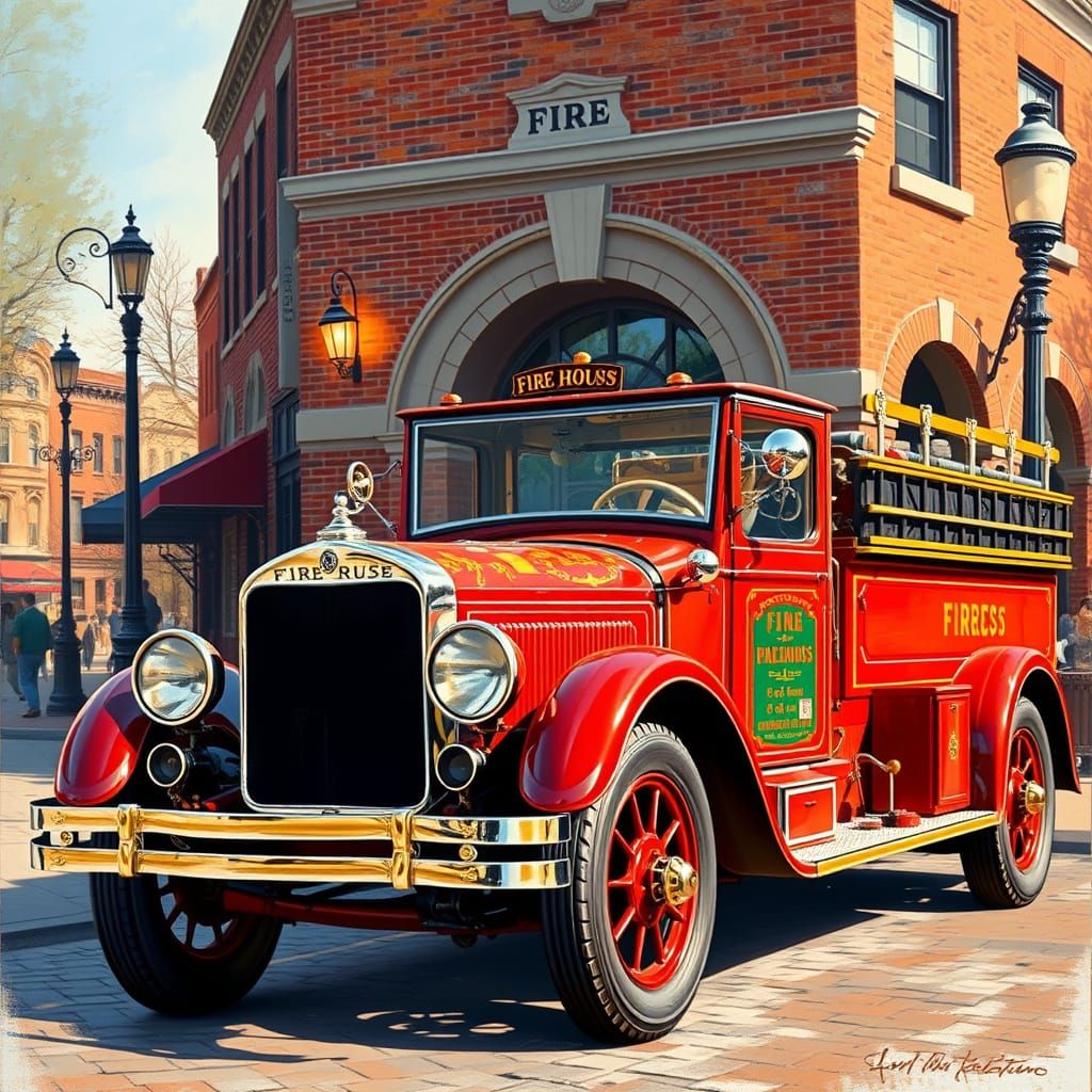 This nostalgic image shows a vintage fire truck parked in front of a classic brick firehouse, surrounded by old-fashioned street lamps and cobblestone streets, rendered in a warm, sunlit palette with bold brushstrokes and textures.
