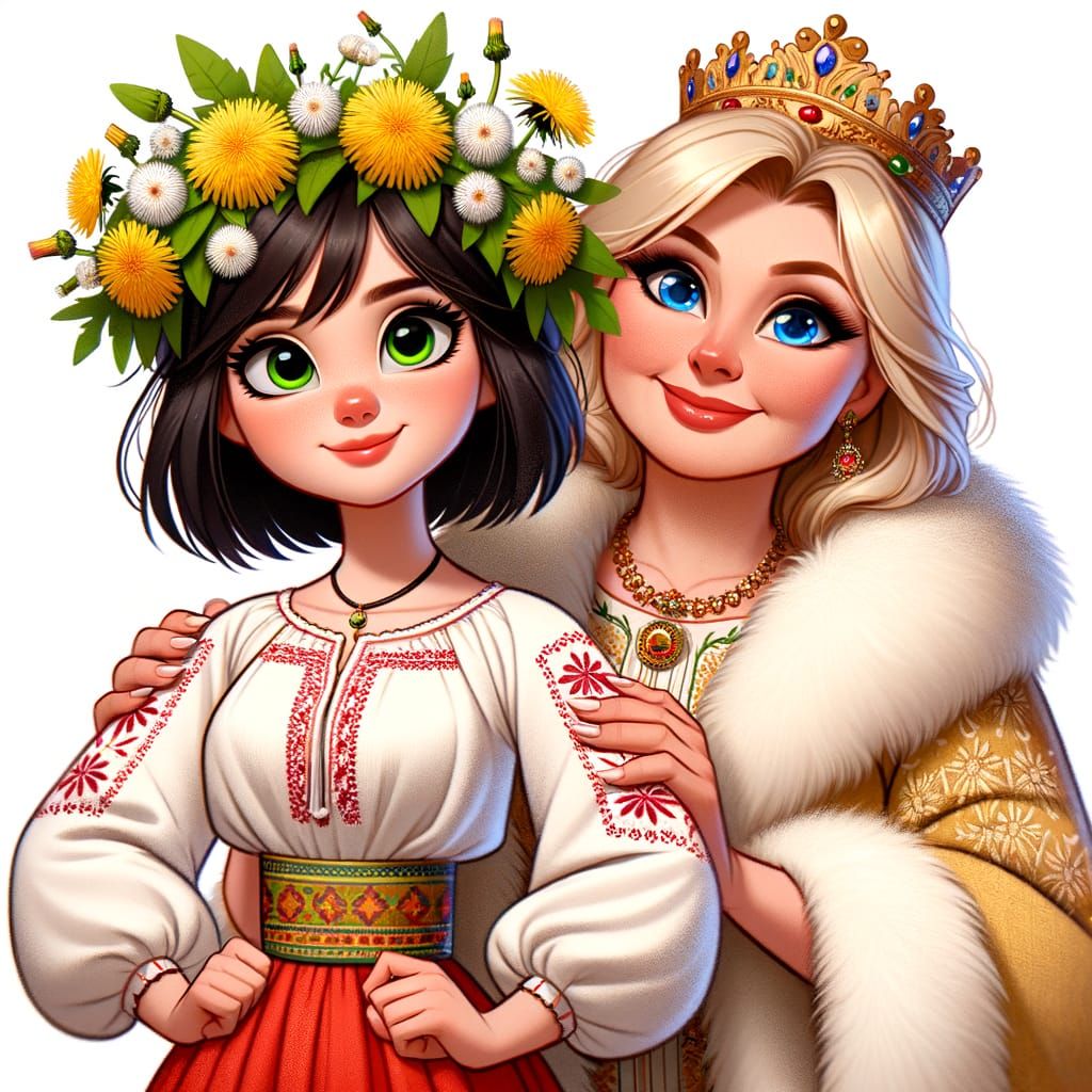 This heartwarming image captures a loving mother and daughter embracing, surrounded by vibrant colors and playful details. The cartoon style conveys a sense of joy and warmth, with the mother's elegant golden ermine fur coat and the daughter's dandelion wreath adding to the whimsical charm.