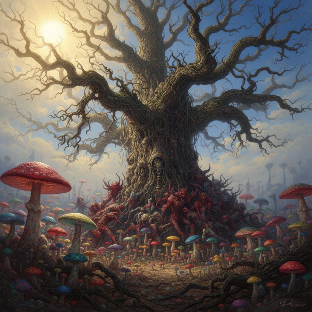 This image shows an ancient oak tree besieged by a horde of demonic, multicolored mushrooms. The scene features dramatic lighting and vivid colors, rendered in a detailed matte painting style with textured detail.