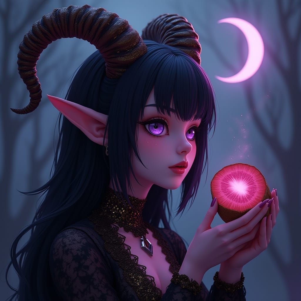 A captivating image of a horned, dark beauty enjoying a kiwi beneath a crescent moon. The figure is adorned in black and purple with gold accents, in a dark fantasy aesthetic.