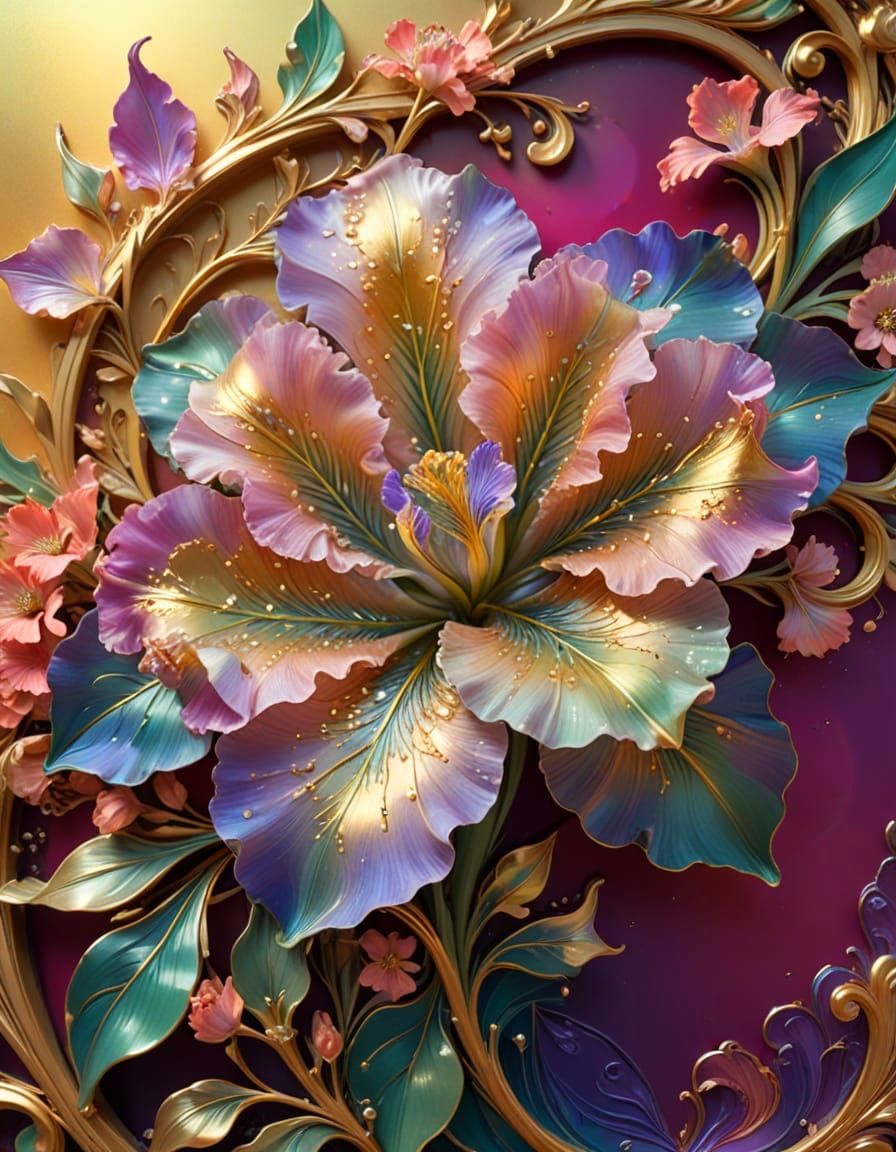 This image showcases a stunning, art-nouveau inspired Iris flower with intricate details and rich, saturated colors. The flower's complex, swirling petals blend in a gradient of magenta and pink hues, with a dark center and vibrant yellow sparks. The background features a muted ultramarine blue and laven...