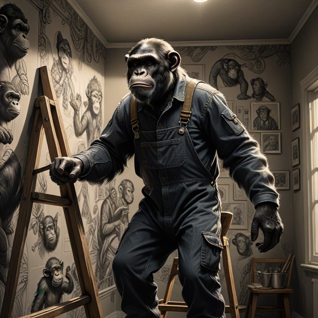 This hyperdetailed charcoal drawing shows a chimpanzee in overalls on a stepladder, meticulously wallpapering a grand ballroom. The 8k image features photorealistic detail, dramatic shadows, and high contrast.