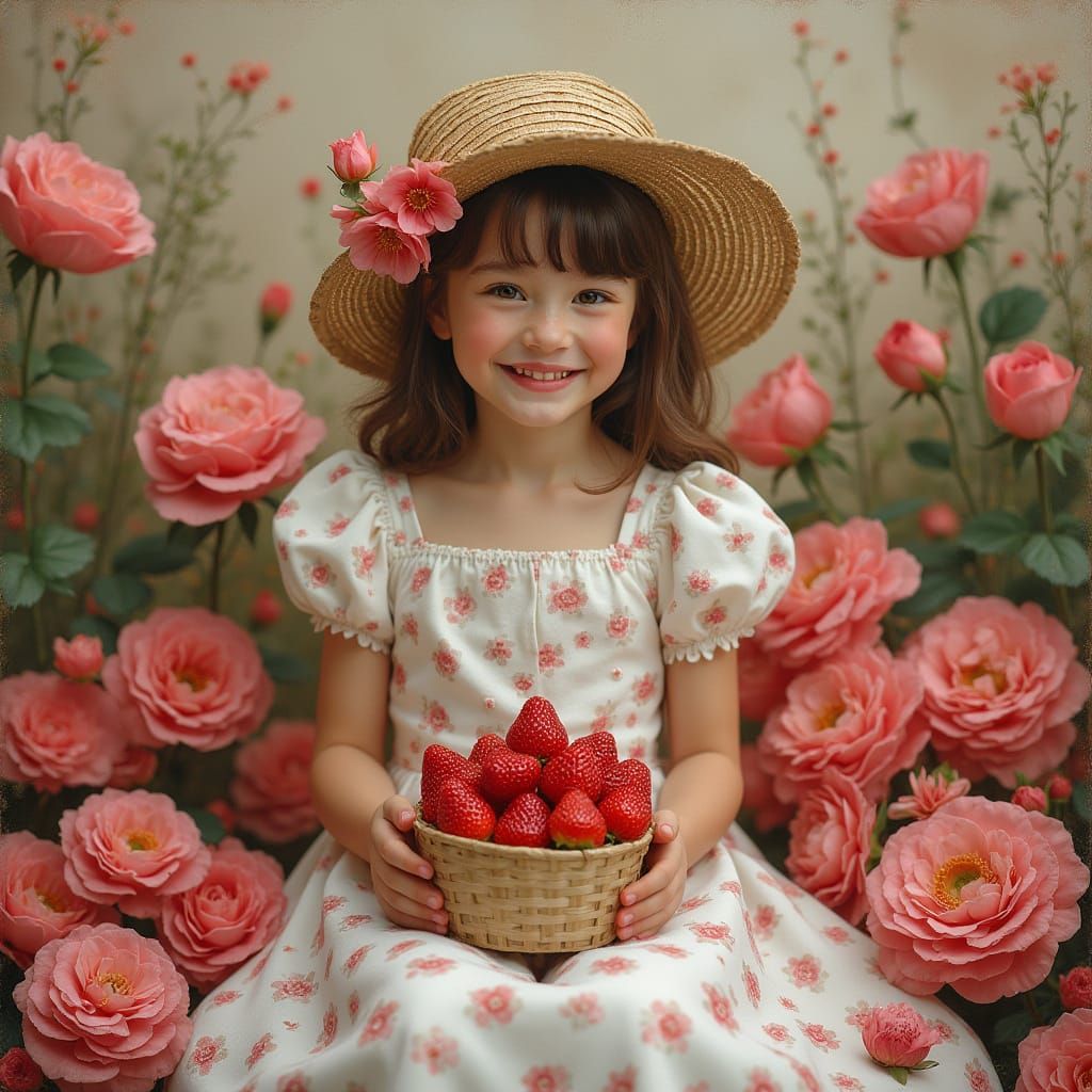 A vibrant image of a smiling young girl in a strawberry-patterned dress, seated in a flower-filled lane holding a basket of strawberries. The artwork is reminiscent of impressionist paintings.