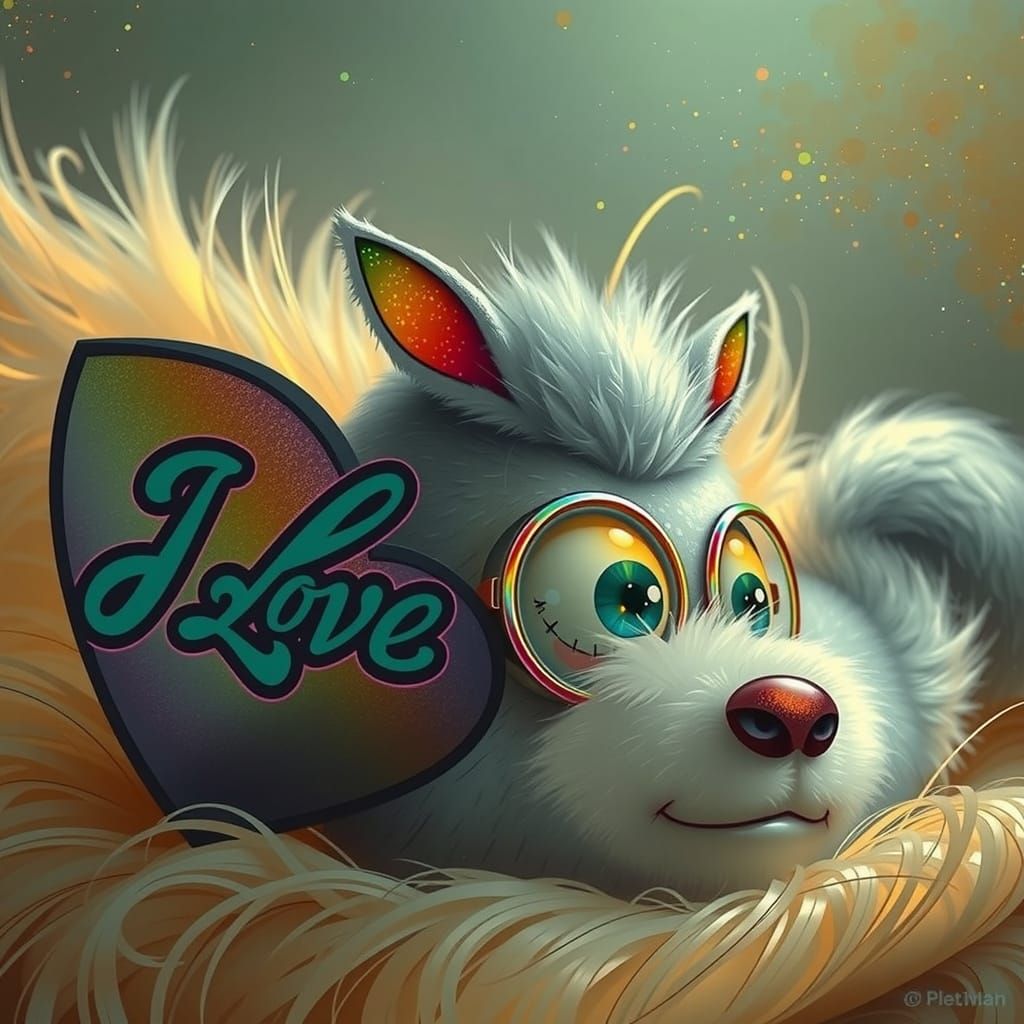 A whimsical pastel rainbow creature with large, multicolored eyes holds a sign. This image, rendered in a vibrant and playful aesthetic, showcases a fluffy being with a sparkly collar.
