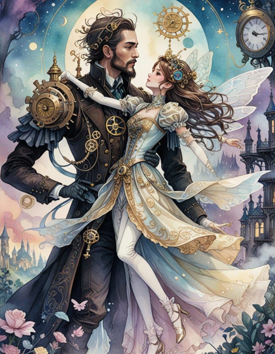 This enchanting image features a delicate fairy couple amidst intricate clockwork mechanisms and a whimsical steampunk landscape, illuminated by a warm golden light, with a focus on beige, brown, and gold hues.