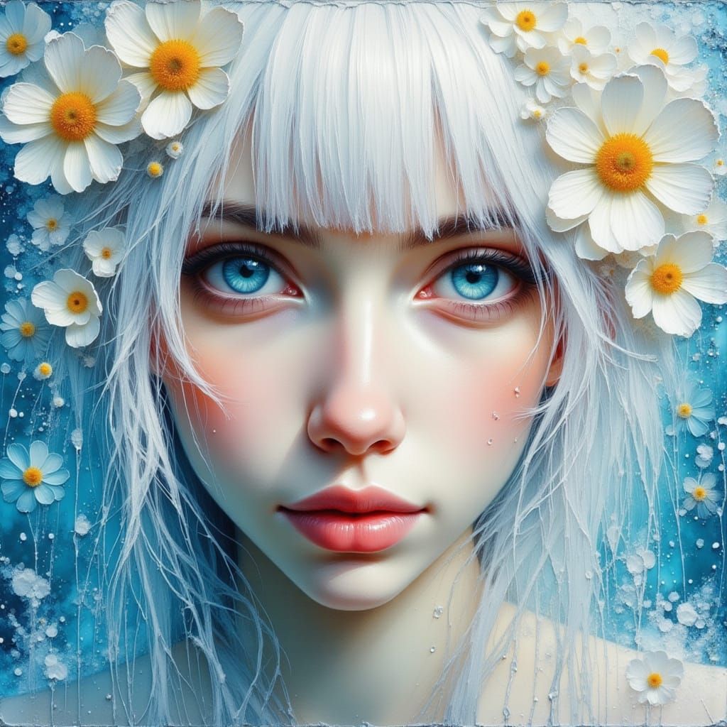 A striking picture of a beautiful white-haired woman with bright blue eyes and a mysterious smile. The background features a splash of water, created as impasto oil painting with transparent watercolor effects.