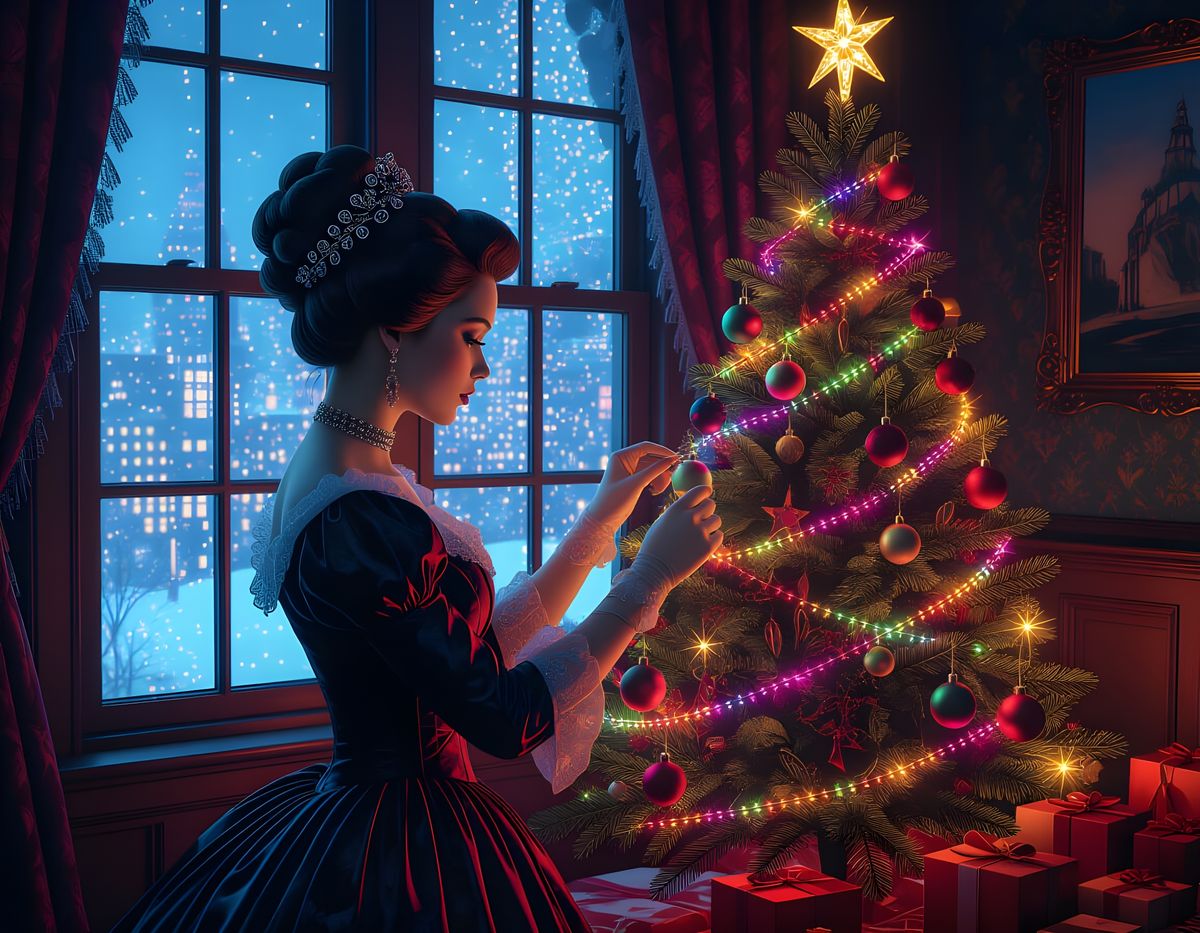 A vintage-style image of a girl in a festive dress decorating a Christmas tree, with a neon-lit winter cityscape visible outside. The room sparkles with bright highlights.