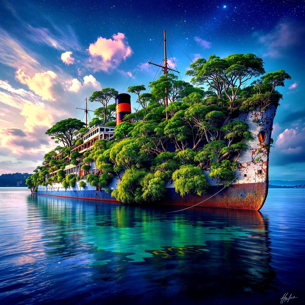 This stunning image shows a century-old steamship transformed into a lush 'floating forest' in Sydney's Homebush Bay, blending industrial heritage with natural wonder in a dreamy, watercolor-inspired digital art piece.