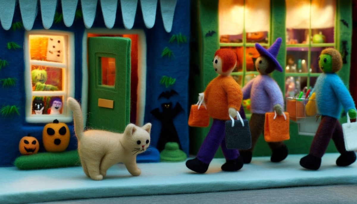 This image shows a felt cat walking through a Halloween town. Needle felted figures emerge from a shop carrying shopping bags, capturing the excitement of the holiday.