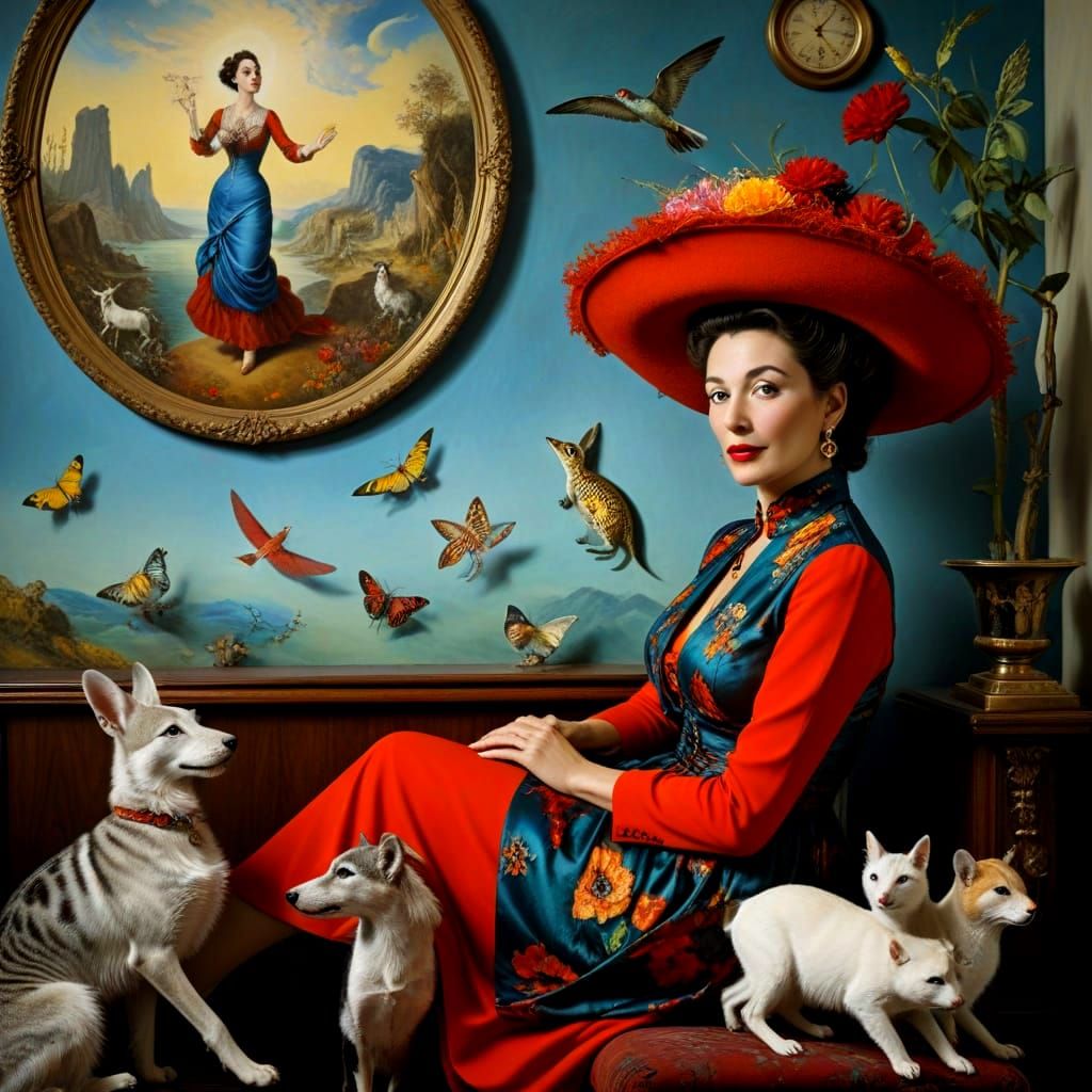 photorealistic full-height view of happy magnetic middle-aged lady in tasteful classy colorful outfit, easy natural graceful posture, with weird harmless fictional animals in complex asymmetric fantastic surrealistic scene by Catrin Welz-Stein, Dorothea Tanning, Evandro Schiavone, Salvador Dali, Ithell ...