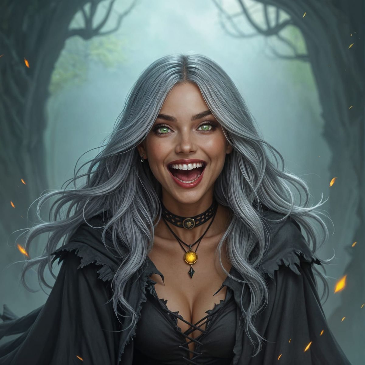 This image depicts a fictional character with silver hair, striking eyes, and a grey robe. Ash surrounds her like a cloak, emphasizing her wicked expression and cackling demeanor.