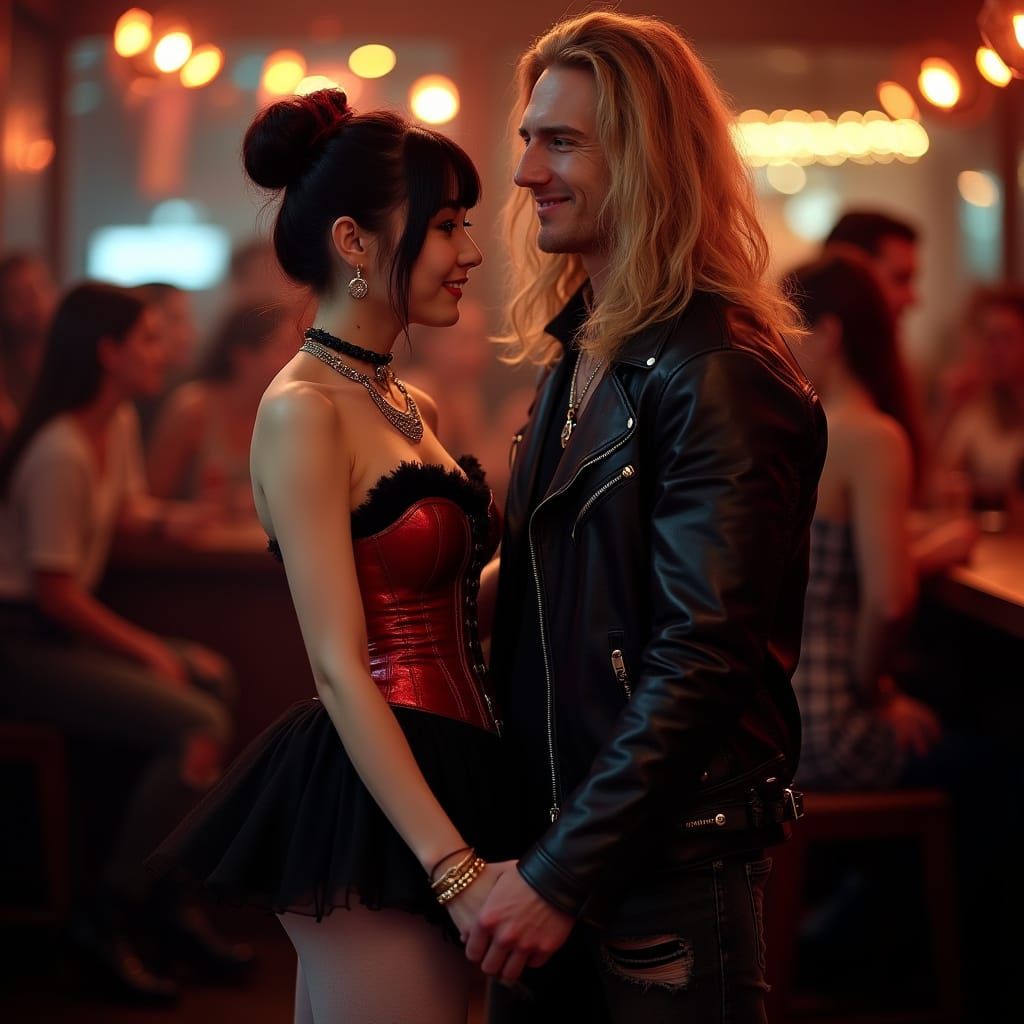 A vibrant photograph captures a Korean author and her Swedish rocker friend joyfully dancing in a Portland goth club. The image features professional photography with bokeh and natural lighting.