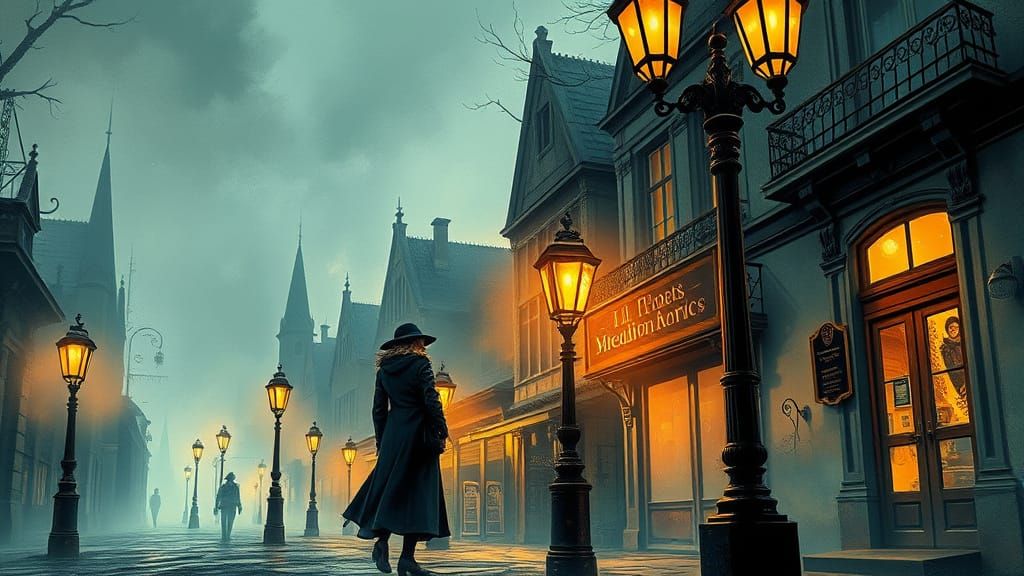 A captivating image of a woman in a long coat standing by a vintage lamp post on a misty, steampunk street. The scene is rendered in a modern European ink painting style with deep colors.