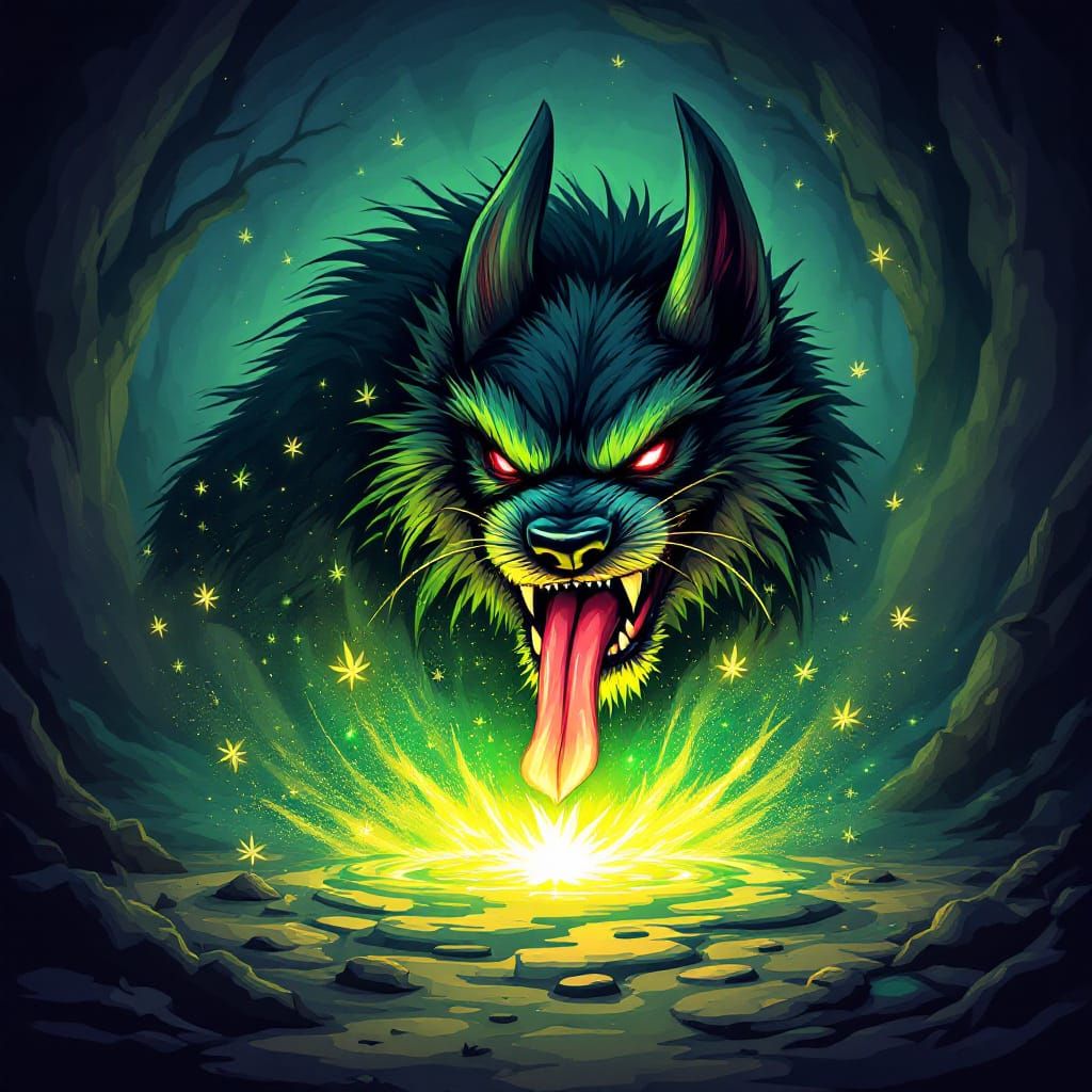 This image showcases a cartoon graffiti-style depiction of a menacing stoner dog with horns and fangs, interacting with a magical portal and glowing firefly trail. Rendered as detailed fantasy concept art.