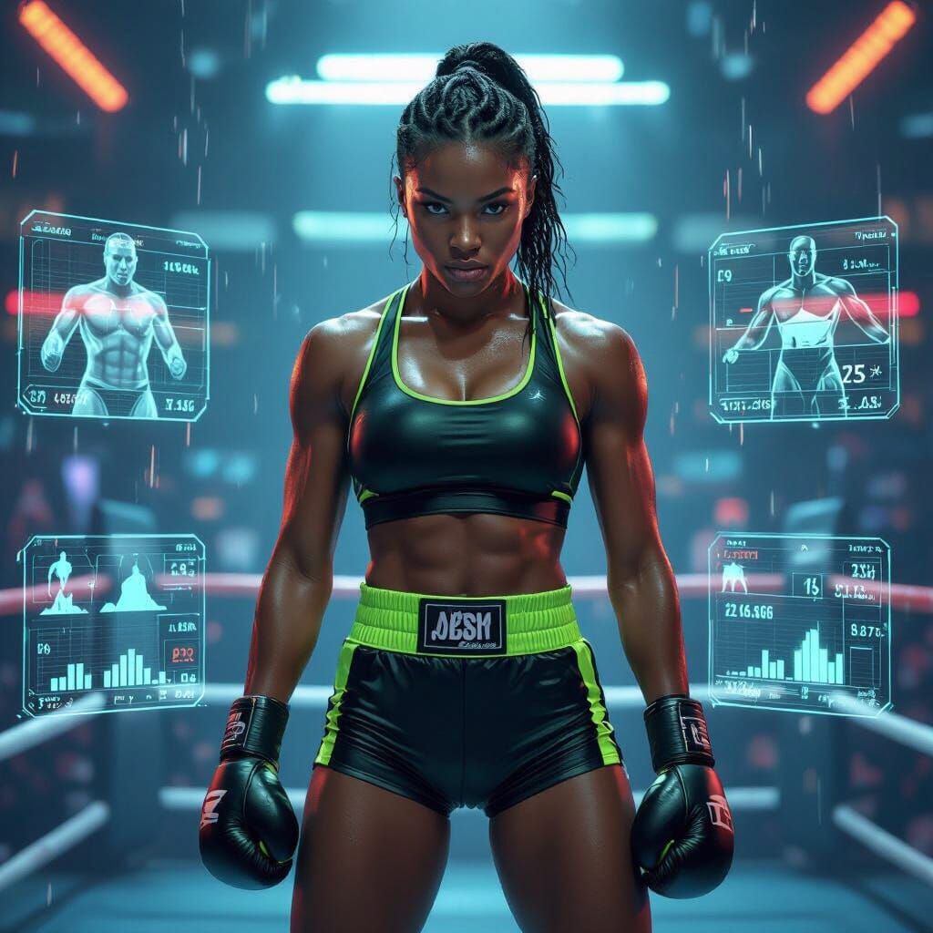 This image shows a strong African woman boxer ready to fight in a futuristic ring. Holographic displays surround her in this vibrant, hyper-realistic digital art.