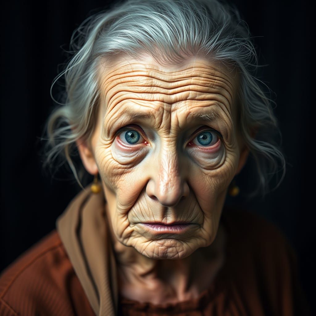 A striking picture of an elderly woman with intense blue eyes and a deeply lined face, looking intently at the camera. The photorealistic portrait uses dramatic lighting and hyperrealistic textures.
