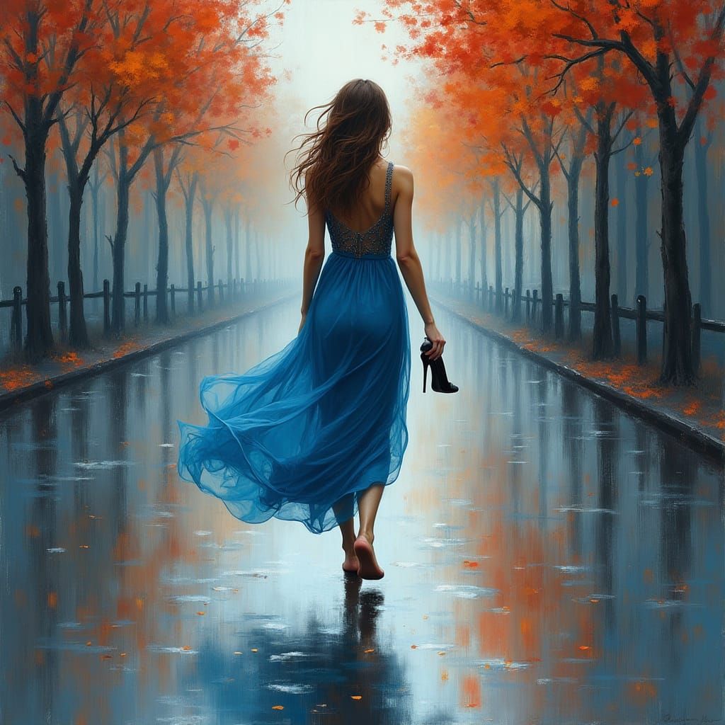 A figure in a blue dress walks barefoot on a wet city street amidst autumn foliage. Impressionistic brushstrokes and a muted palette evoke a melancholic mood.