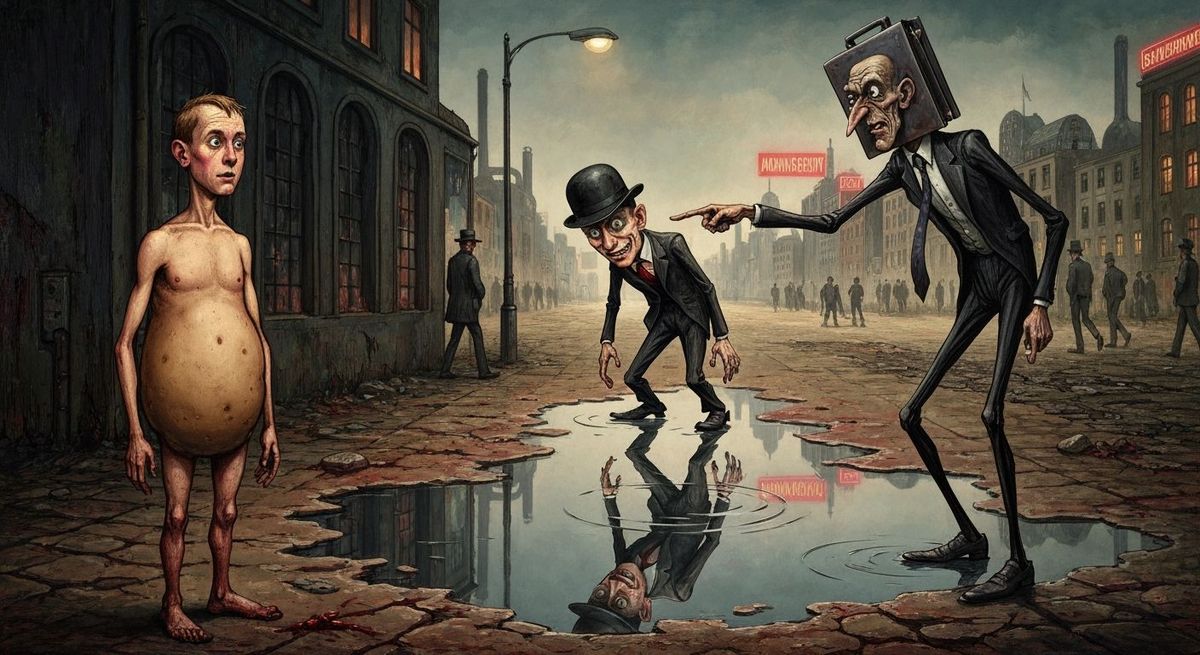 A striking image in the style of George Grosz, depicting a young man's transformation in a chaotic city. Features grotesque figures and a muted, gritty color palette reflecting social critique.
