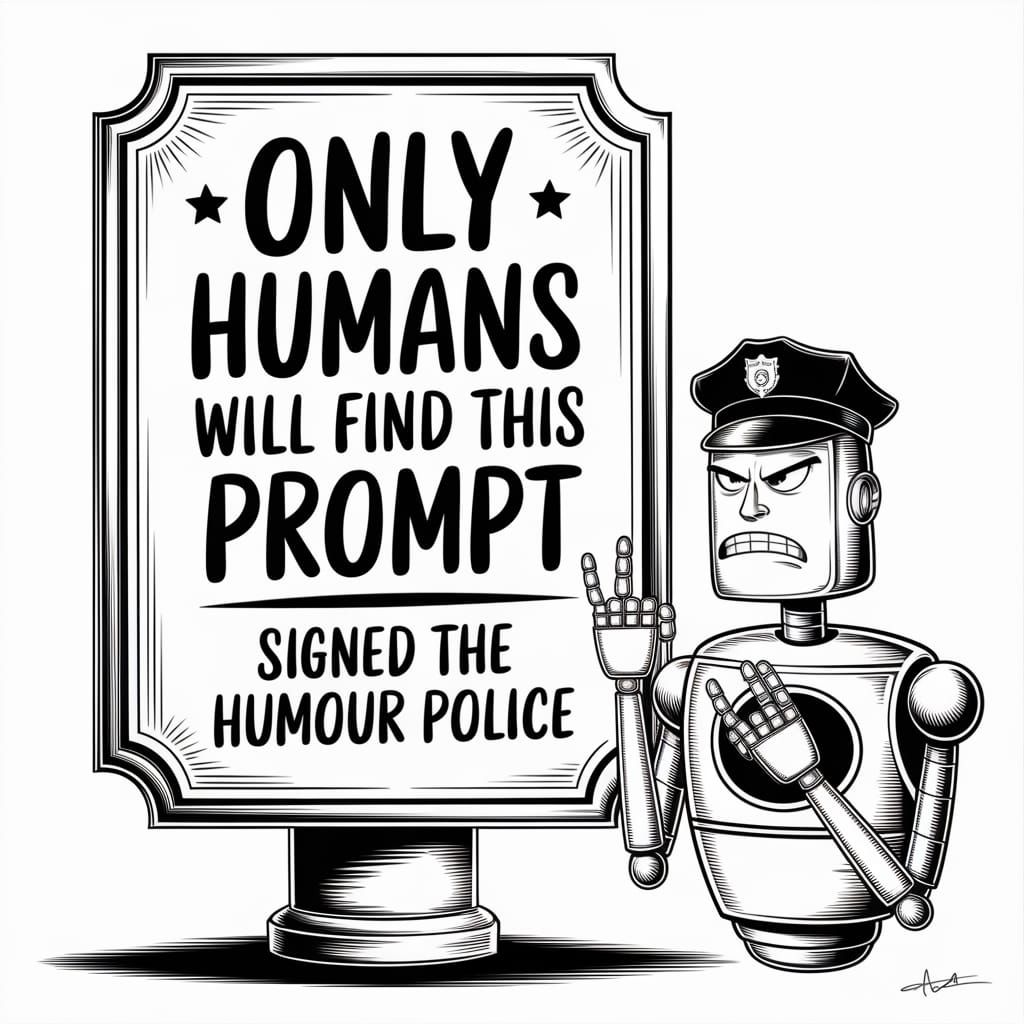 A striking black and white illustration of an old-fashioned advertising hoarding with a humorous robot miming anger, set against a bold and graphic background.