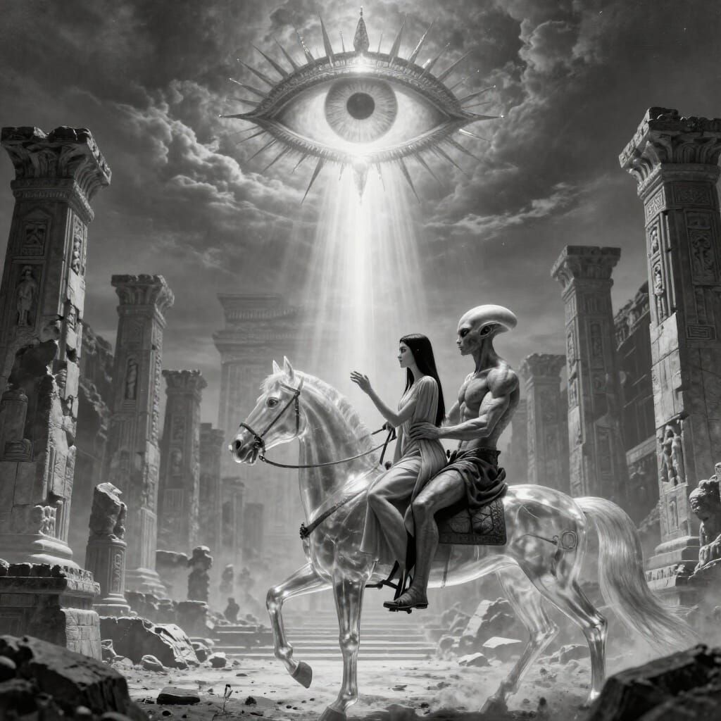 michelangelo painting style, statues guys around, venusian alien gives hand to beautiful armenian woman with ultra straight hair, very connected spiritual, they ride transparent pur sang horse , in the epic ruin of city of shamballah, in background third eye, ray of lights between characters, ultra ...
