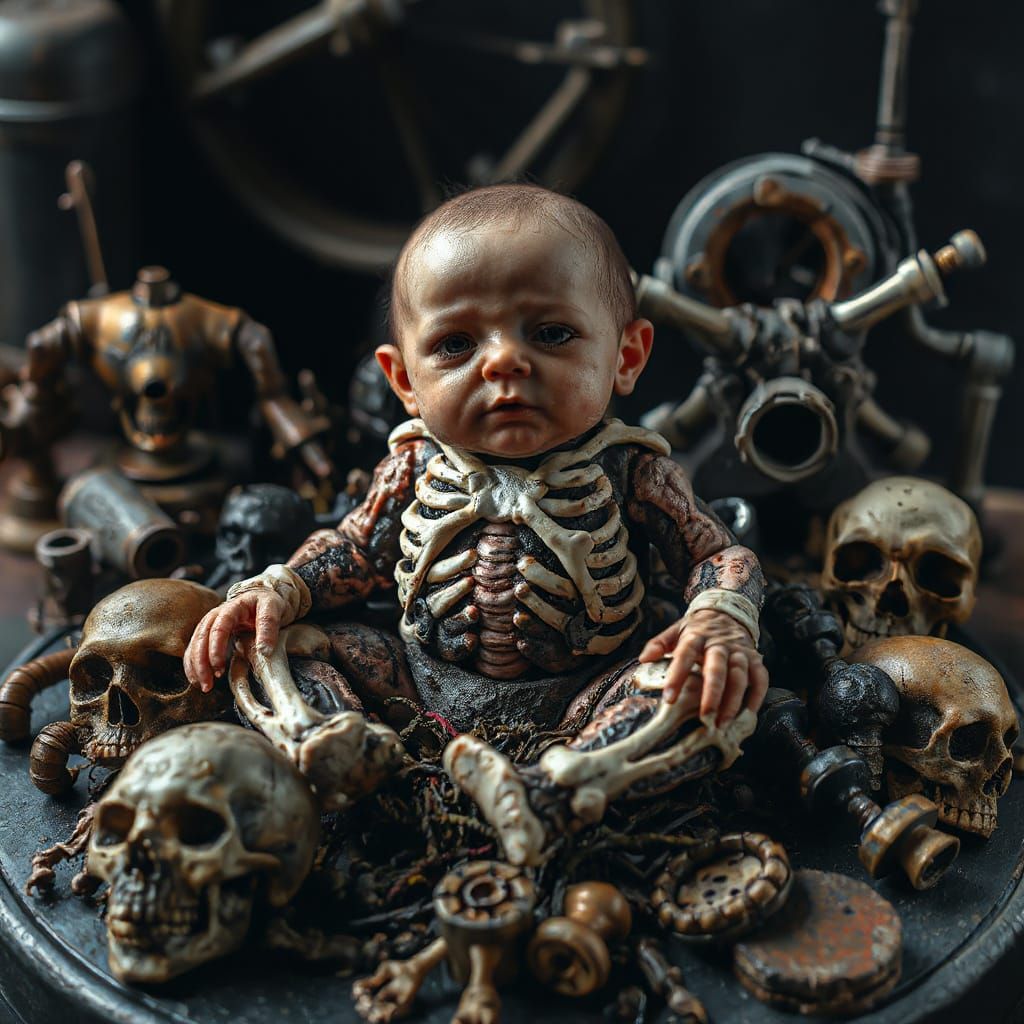 This image shows a cake sculpted into a grotesque baby form. The edible creation, with icing skin and bone details, is set amongst rusted mechanical and organic elements, in a biomechanical style.