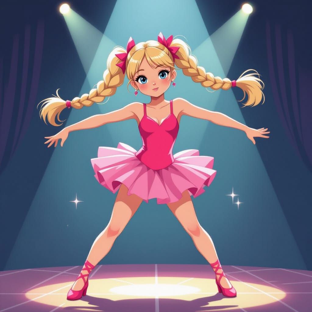 This image shows a blonde girl with braided pigtails dancing on a brightly lit stage while wearing a pink leotard. The image is reminiscent of pop surrealism.
